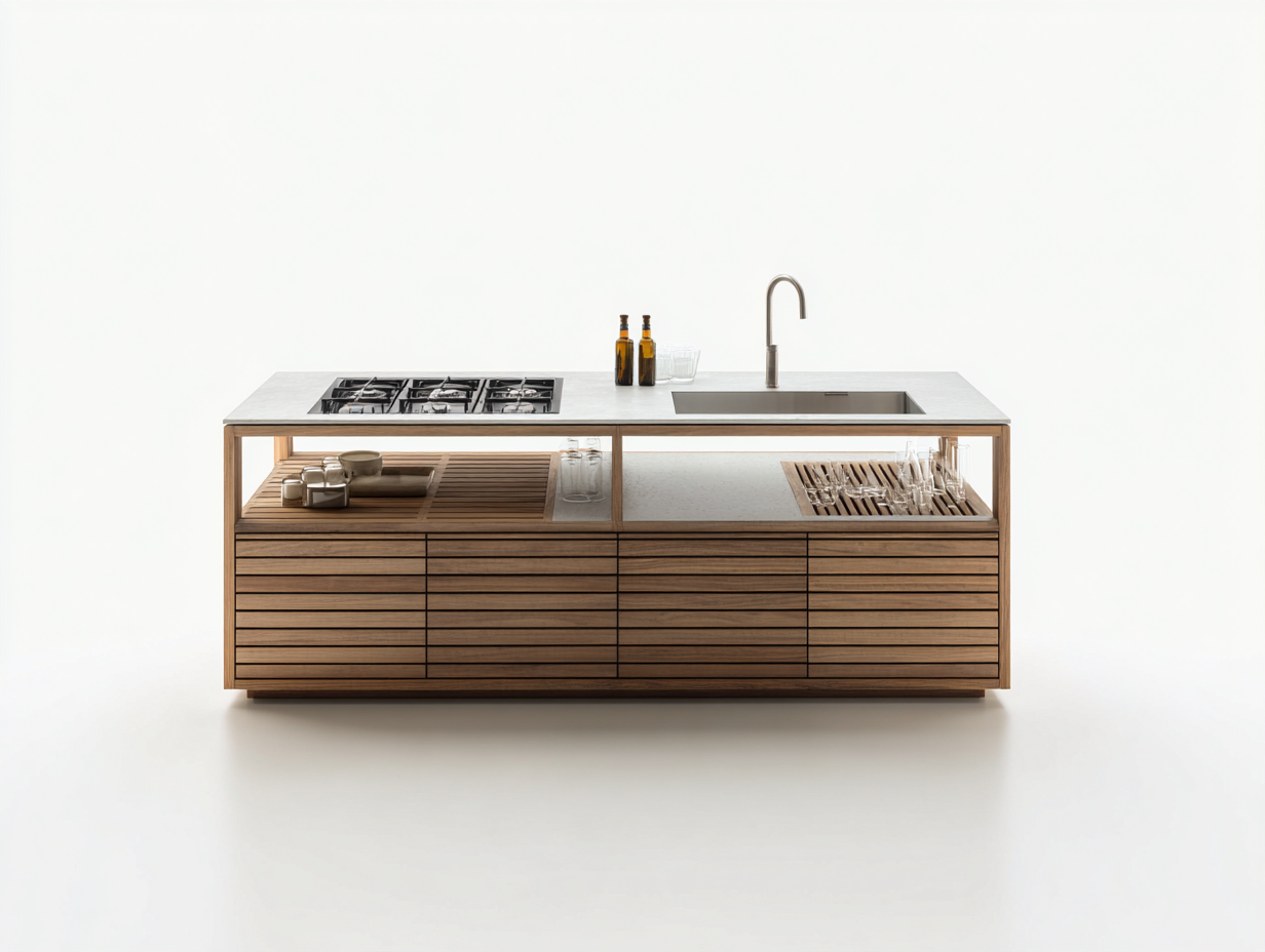 Isola da cucina da esterno per uso outdoor con piano composito e lavello 200x70x90 cm - naturale - bianco - design moderno funzionale